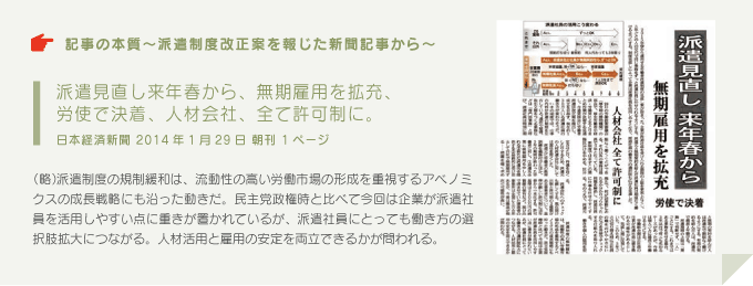 以上のような問題意識に基づいて、今回の改正案は「専門26業務は現実に即していないから廃止する」、そして「常用代替防止という派遣先の正社員保護の発想から、派遣労働者自身の保護へとスタンスを切り替える」というのが、基本的な考え方になっていると思います。